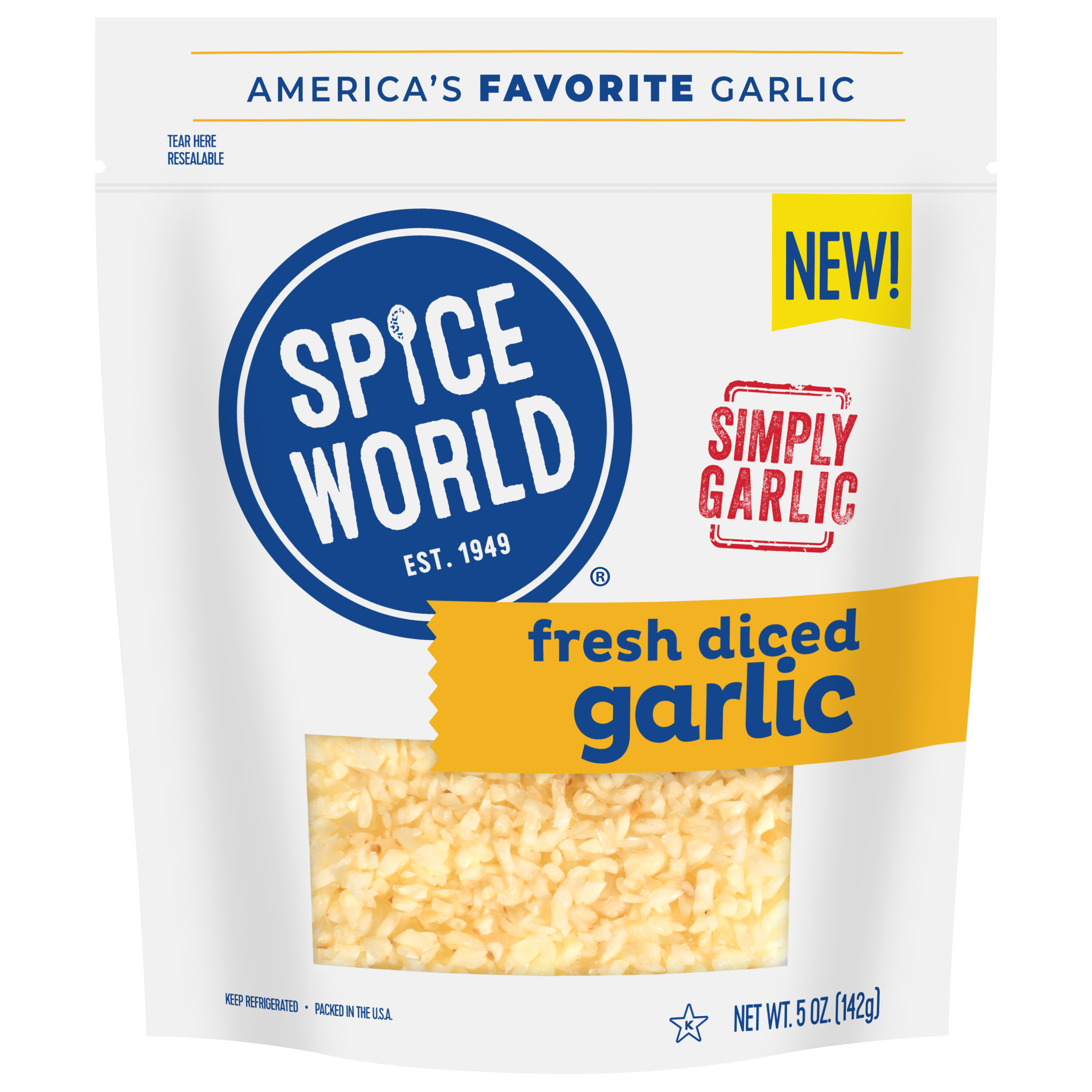 Spice World’s Fresh Diced Garlic is available in a 5-ounce resealable pouch and is perfect for adding fresh and zesty flavor to a wide variety of dishes, including marinades, soups, dressings and much more. Fresh Diced Garlic is the newest in Spice World’s robust line of garlic products, including chopped and minced garlic, Elephant Garlic, Fresh Purple Garlic, and Founder’s Garlic.
