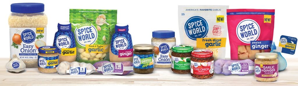 Blend cream cheese, Roka Blue cheese spread, Old English spread, grated sweet onion, Worcestershire sauce, and Spice World Ready-to-Use Minced Garlic together until smooth.