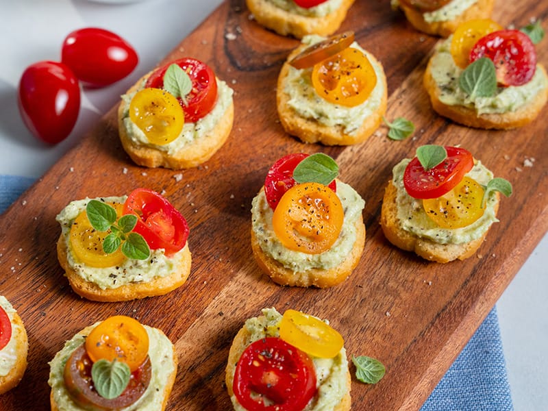 Instead of crostini, hollow out larger cherry tomatoes using a small spoon or melon baller. Fill each tomato with the pesto avocado mixture and serve immediately — or refrigerate for up to 2 days.